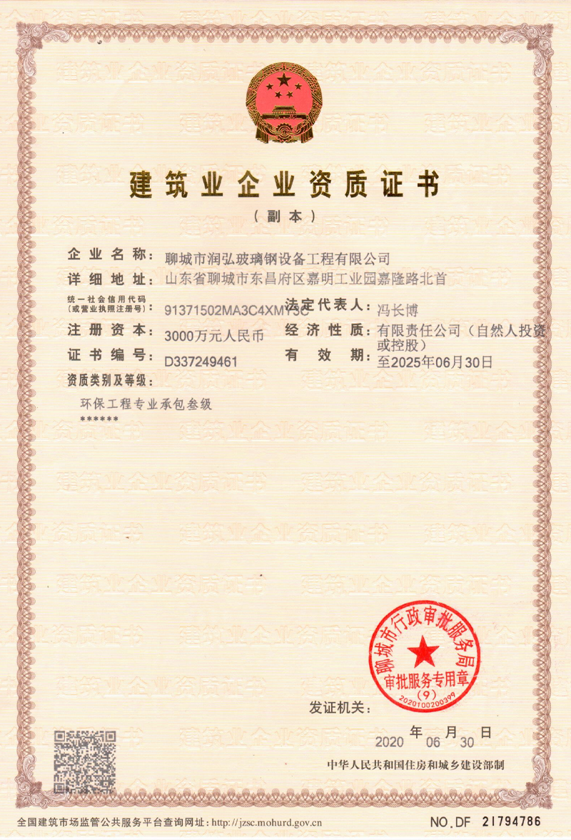 公司為聊城市市級(jí)守合同重信用企業(yè)、中國(guó)環(huán)境保護(hù)產(chǎn)業(yè)協(xié)會(huì)會(huì)員單位、中國(guó)復(fù)合材料工業(yè)協(xié)會(huì)會(huì)員單位。擁有環(huán)保工程專業(yè)承包三級(jí)資質(zhì),擁有自己獨(dú)立的科研團(tuán)隊(duì)。在職人員中,高級(jí)工程師1人、注冊(cè)安全工程師1人、注冊(cè)二級(jí)建造師2人、注冊(cè)環(huán)保工程師2人、注冊(cè)環(huán)評(píng)工程師1人、各種技術(shù)技工人員31人。