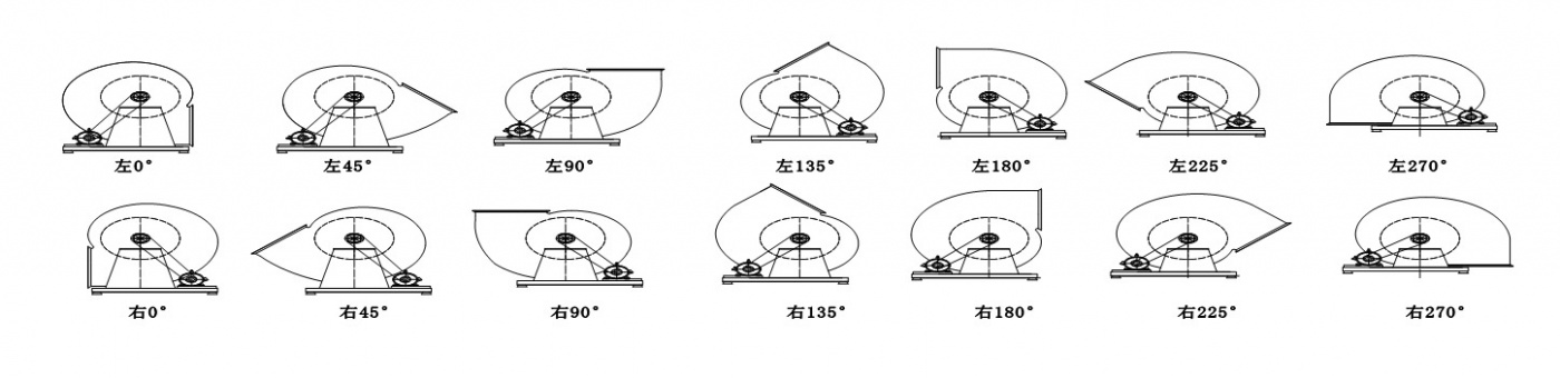 從電機一端正視,葉輪順時針旋轉的稱為右旋風機,以“右”表示,反之為左旋風機,以“左”表示。風機的出風口位置,以機殼的出風口角度表示。