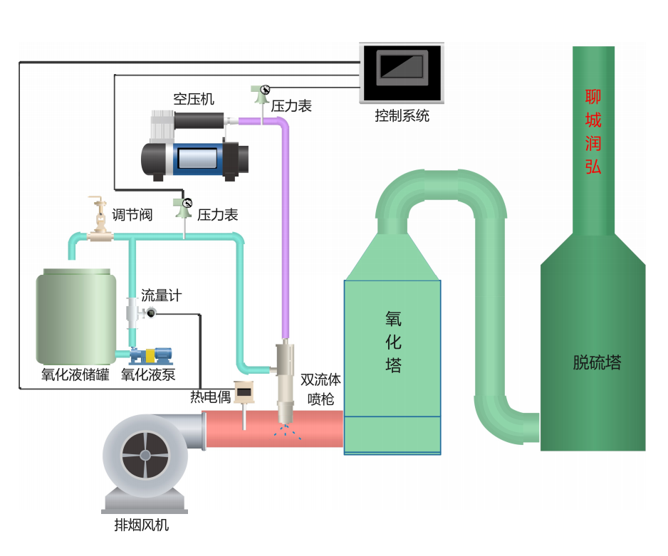 煙氣中NOx的主要組成是NO(占絕大部分)、NO2、N2O5等,NO難溶于水,反應(yīng)活性較差,而NO2、N2O5等是可以溶于水并且與堿性容易進(jìn)行反應(yīng),利用這一原理,選擇一強(qiáng)氧化劑可以將NO氧化成高價(jià)態(tài)的NO2、N2O3、N2O5等,且溶于水生成HNO2和HNO3,溶解能力大大進(jìn)步,從而去除煙氣中的氮氧化物。目前來說,主要的強(qiáng)氧化劑主要有雙氧水、臭氧、次氯酸鈉、高錳酸鉀等。
